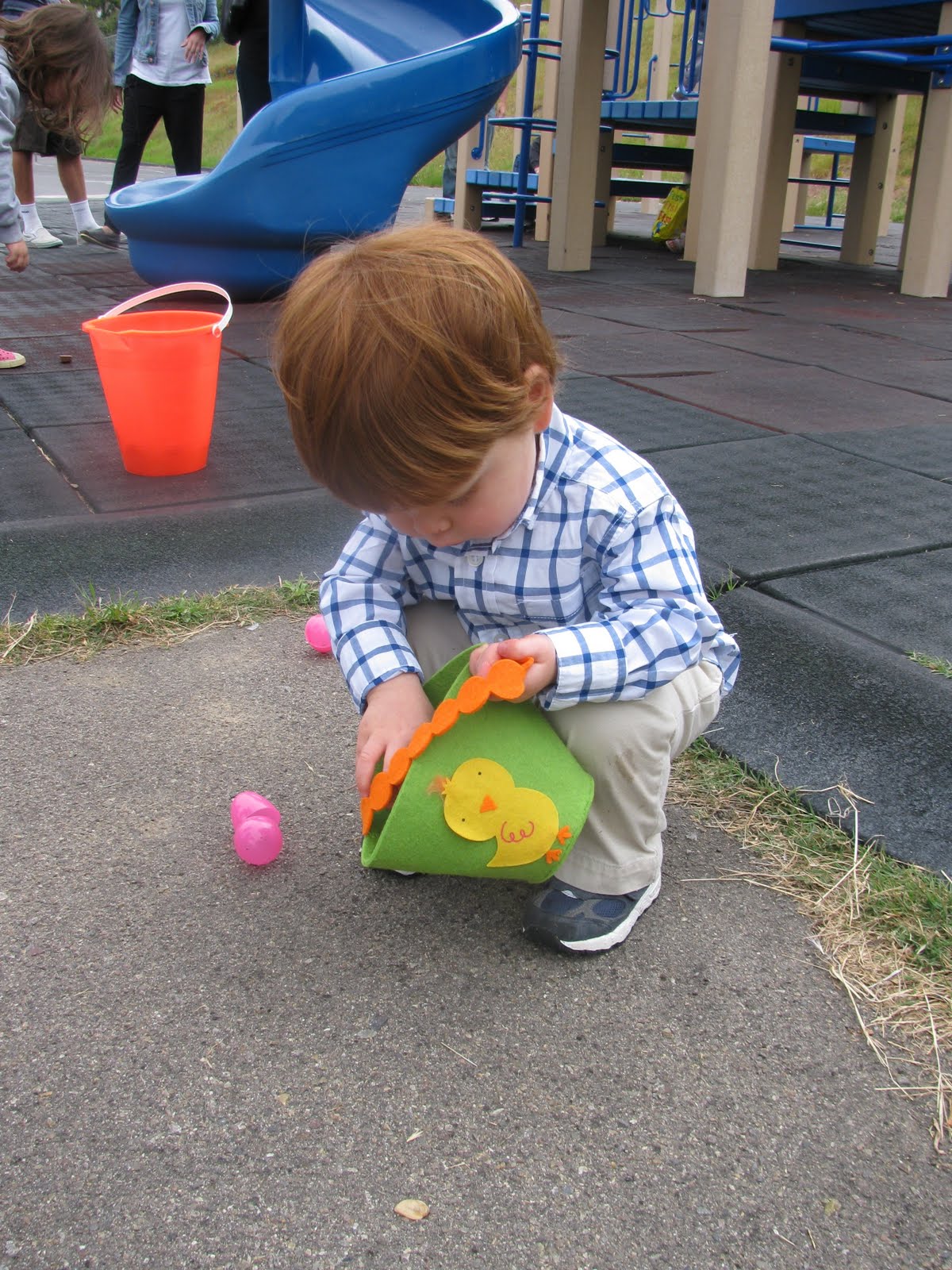 This weekend, the local Farmer's Market held an Easter Egg hunt for the kiddos. Well, it was less of a hunt and more of a scramble. Hundreds of eggs we scattered about the field and, when the whistle was blown, kids of all ages made a mad dash towards them. Kaden had zero idea what was going on - I think he just picked up a few eggs (at our prompting) on his way to the playground. The older, more wizened kids, opened the eggs, took the candy, and left the pastel plastic shell....and those were the ones Kaden wanted to gather.